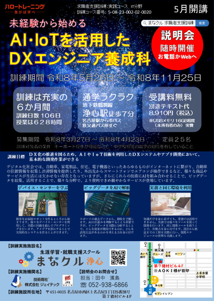 「AI・IoT・を活用したDXエンジニア養成科」の受講生の募集を開始します。