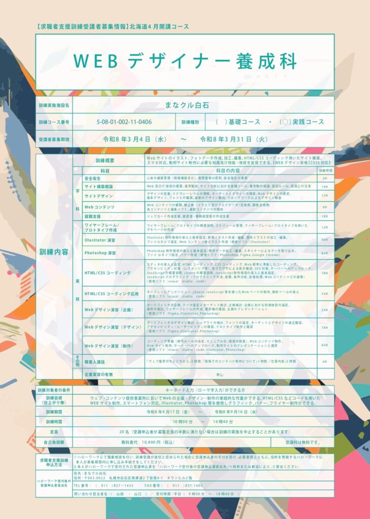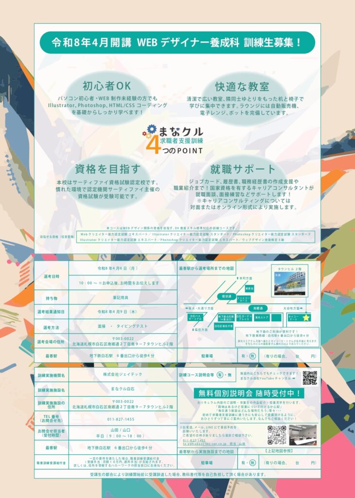 まなクル白石では、4月開講求職者支援訓練【WEBデザイナー養成科】を開講いたします。