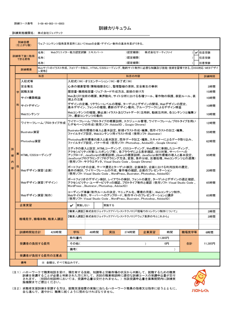 | Illustrator演習 | Illustrator制作環境の導入と基本設定、新規イラスト作成・編集、既存イラストの加工・編集、ファイルタイプ設定、Webコンテンツ用イラスト作成 (使用ソフト:Illustrator) | 55 |